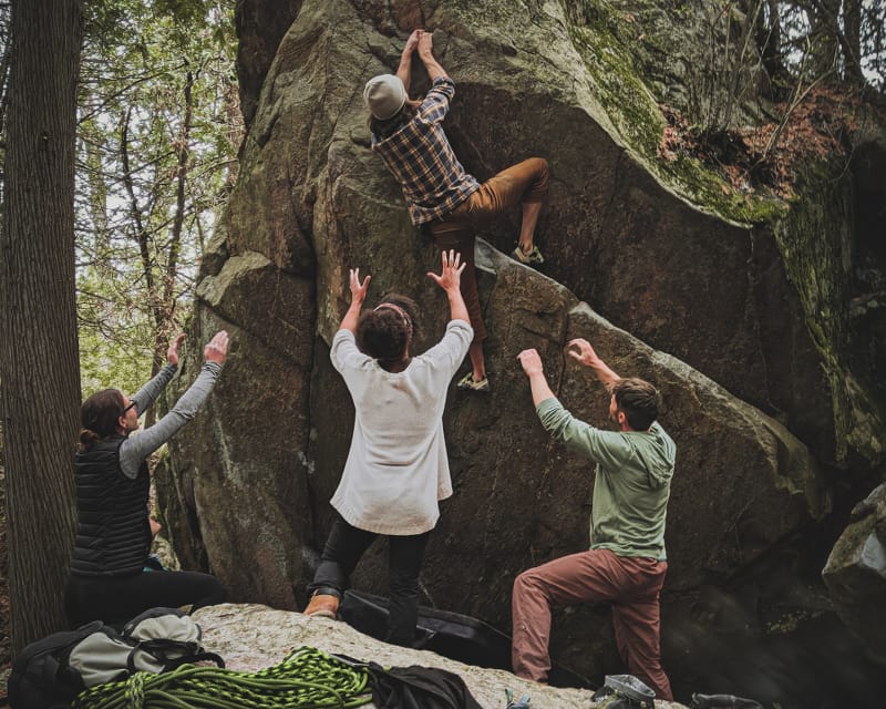 If you go outdoor bouldering with a long approach, go for a versatile pair of rock climbing pants that also offers some features like abrasion resistance and is water repellent.